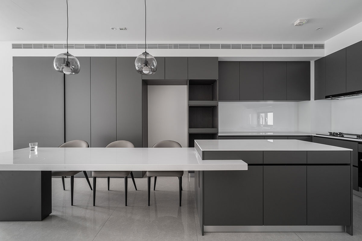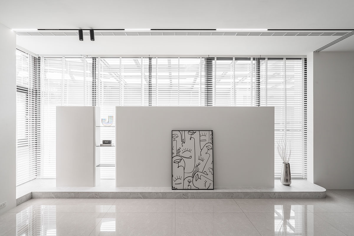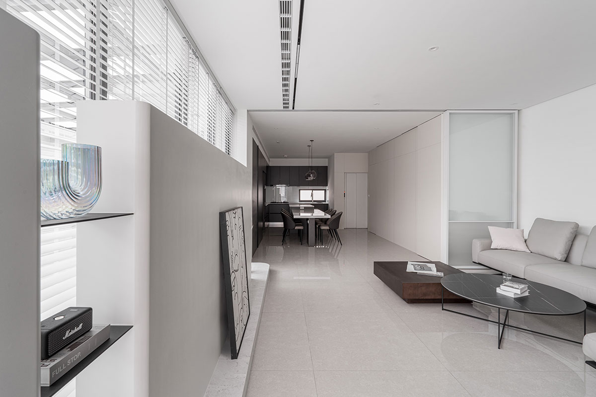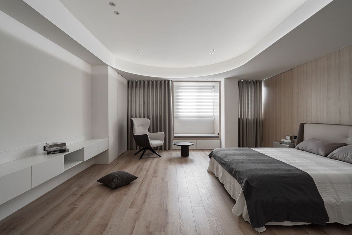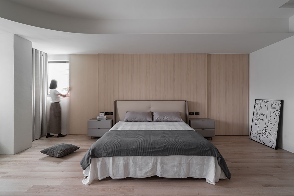 Upon opening the door, the dual-aspect windows flood the space with abundant sunlight, enhancing the spaciousness and clearness of the interconnected living and dining areas. The refined gray-white color palette defines the cleanness of the communal space, elegantly resulting in a homely and comfortable situation. Move upward, balmy wood textures envelop the private quarters, complemented by the gentle curves of ceilings and walls, fostering a sense of relaxation and warmth, perfect for countless moments of rest and repose. Additionally, the designer thoughtfully included daybeds by the bedroom windows, encouraging family intimacy beyond the shared areas. The residence, characterized by brightness, clarity, and openness, aspires to evolve with time, fostering deep emotional bonding in the family of three and realizing a precious haven for the bliss of togetherness.