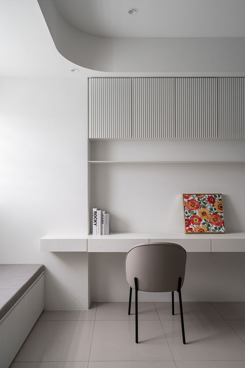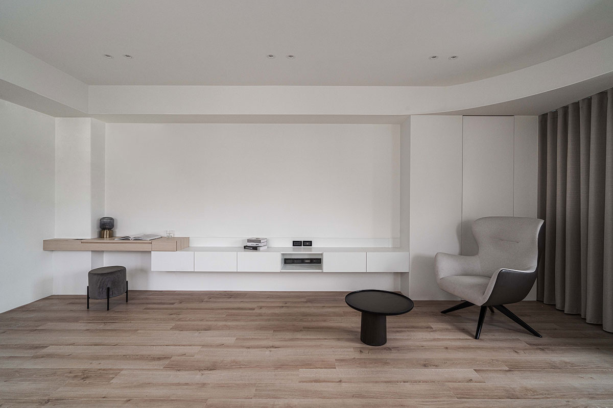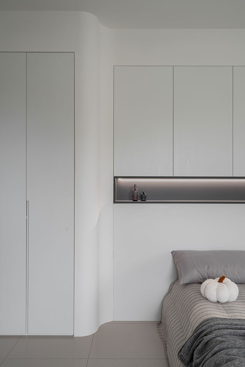 Upon opening the door, the dual-aspect windows flood the space with abundant sunlight, enhancing the spaciousness and clearness of the interconnected living and dining areas. The refined gray-white color palette defines the cleanness of the communal space, elegantly resulting in a homely and comfortable situation. Move upward, balmy wood textures envelop the private quarters, complemented by the gentle curves of ceilings and walls, fostering a sense of relaxation and warmth, perfect for countless moments of rest and repose. Additionally, the designer thoughtfully included daybeds by the bedroom windows, encouraging family intimacy beyond the shared areas. The residence, characterized by brightness, clarity, and openness, aspires to evolve with time, fostering deep emotional bonding in the family of three and realizing a precious haven for the bliss of togetherness.