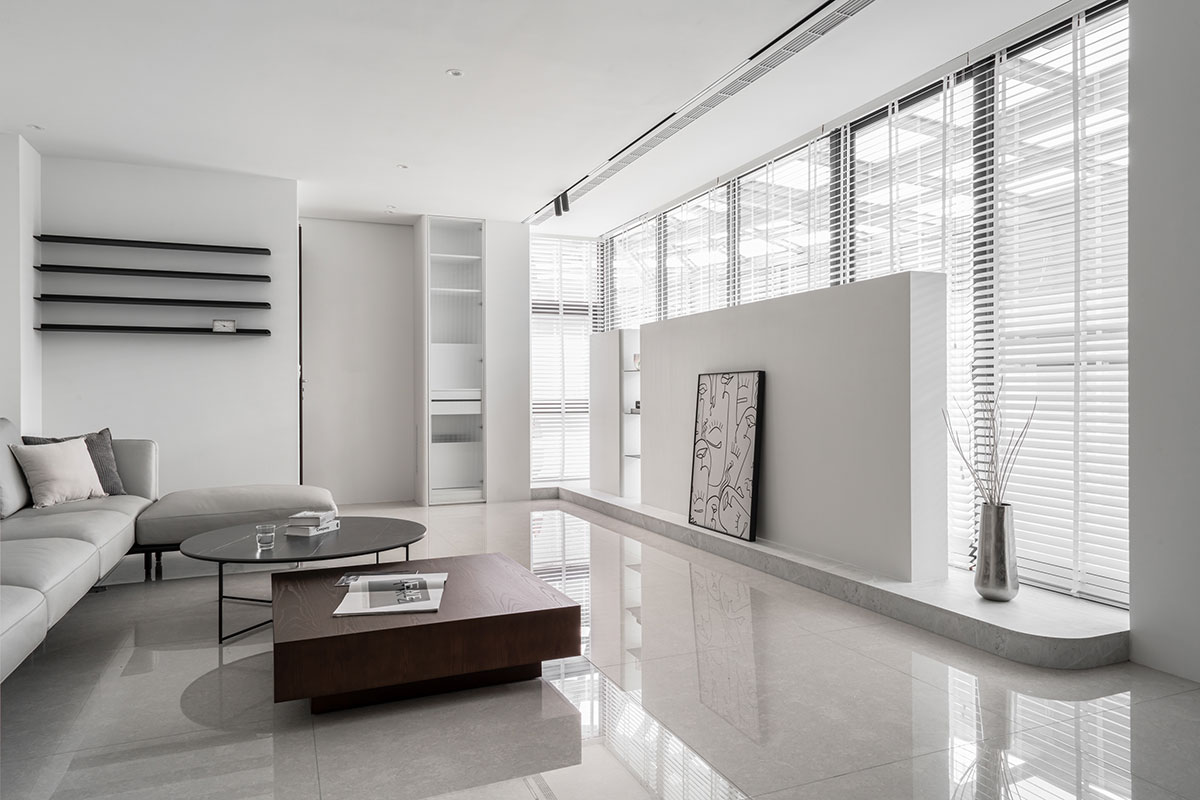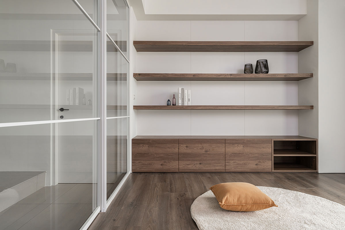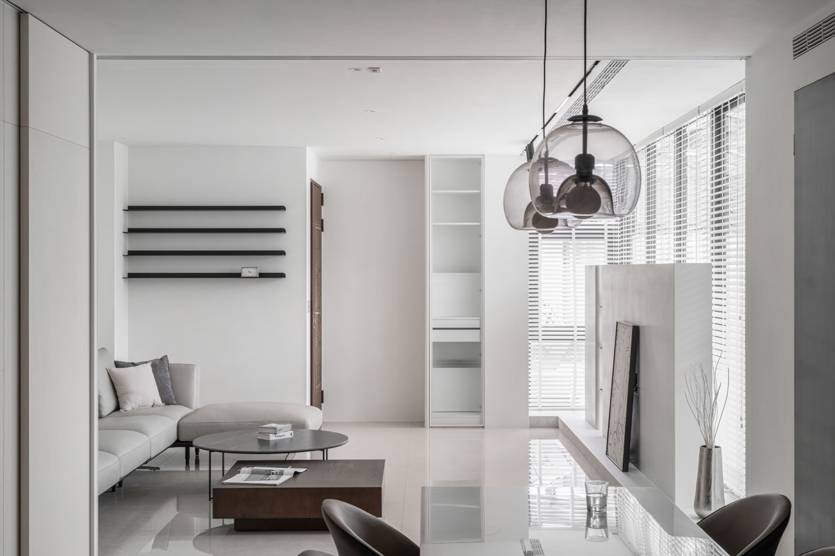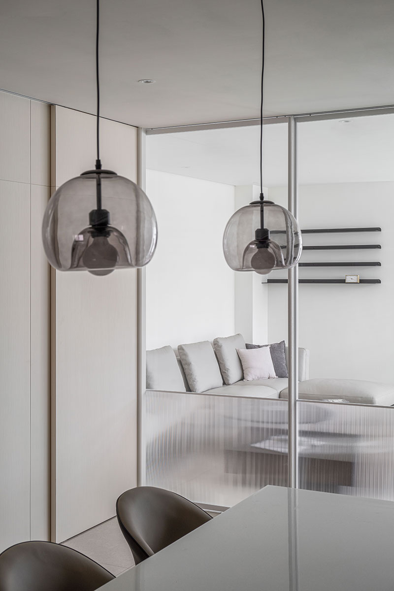 Upon opening the door, the dual-aspect windows flood the space with abundant sunlight, enhancing the spaciousness and clearness of the interconnected living and dining areas. The refined gray-white color palette defines the cleanness of the communal space, elegantly resulting in a homely and comfortable situation. Move upward, balmy wood textures envelop the private quarters, complemented by the gentle curves of ceilings and walls, fostering a sense of relaxation and warmth, perfect for countless moments of rest and repose. Additionally, the designer thoughtfully included daybeds by the bedroom windows, encouraging family intimacy beyond the shared areas. The residence, characterized by brightness, clarity, and openness, aspires to evolve with time, fostering deep emotional bonding in the family of three and realizing a precious haven for the bliss of togetherness.
