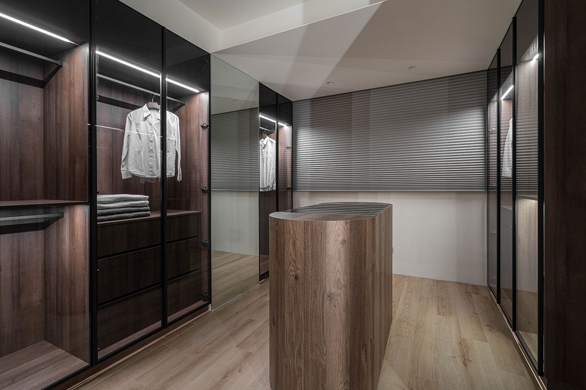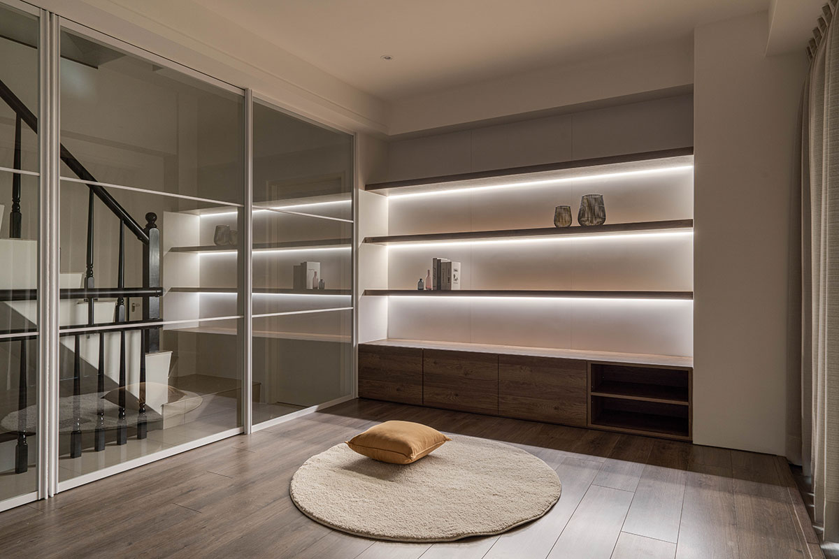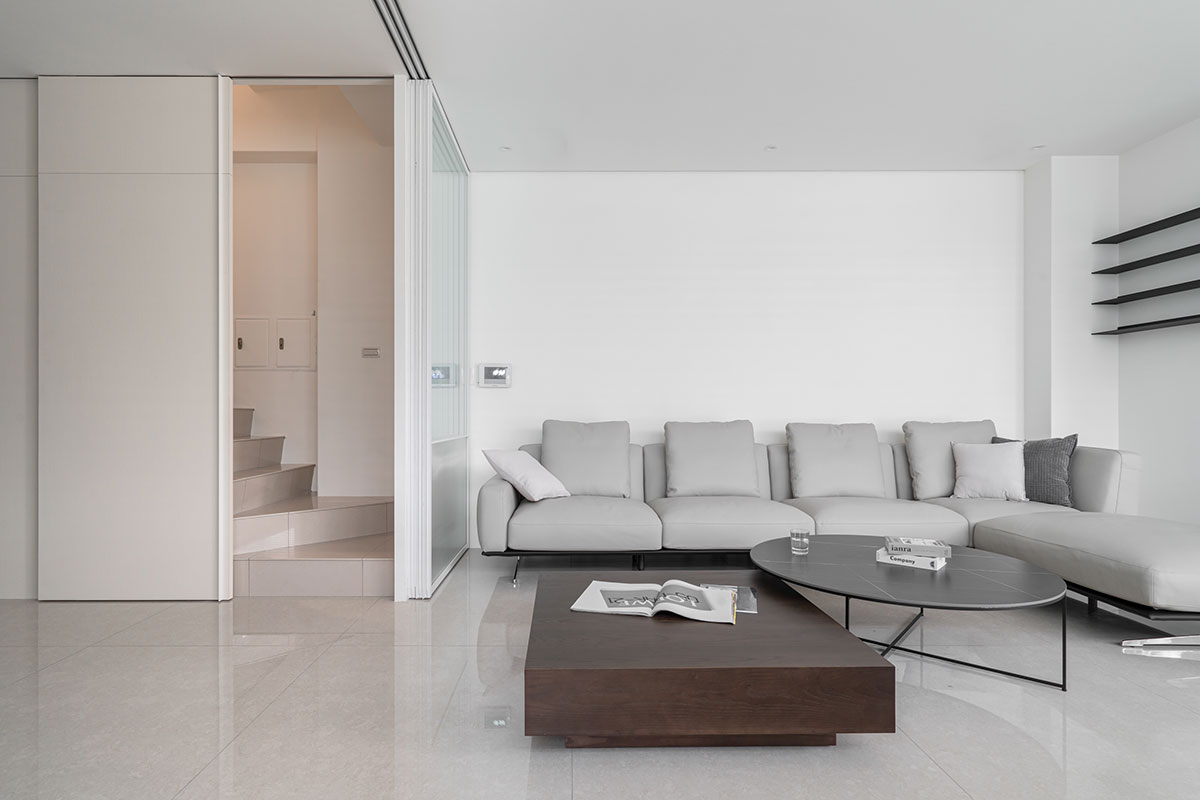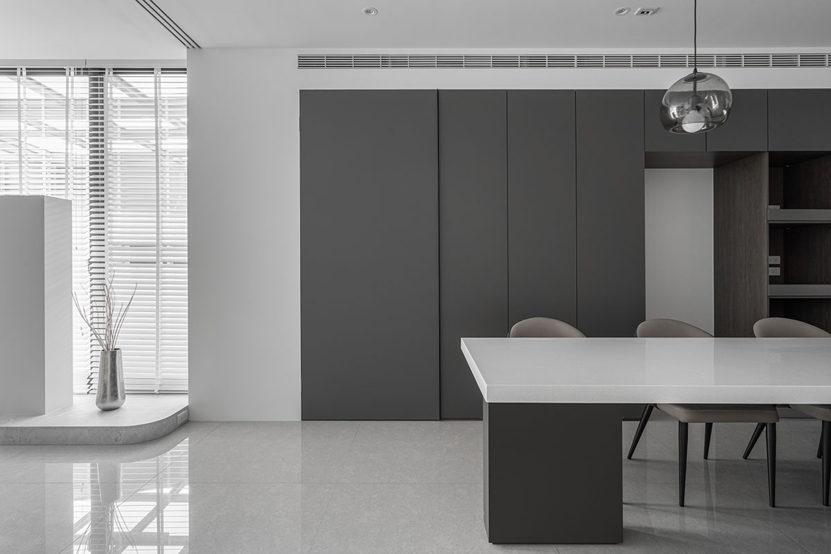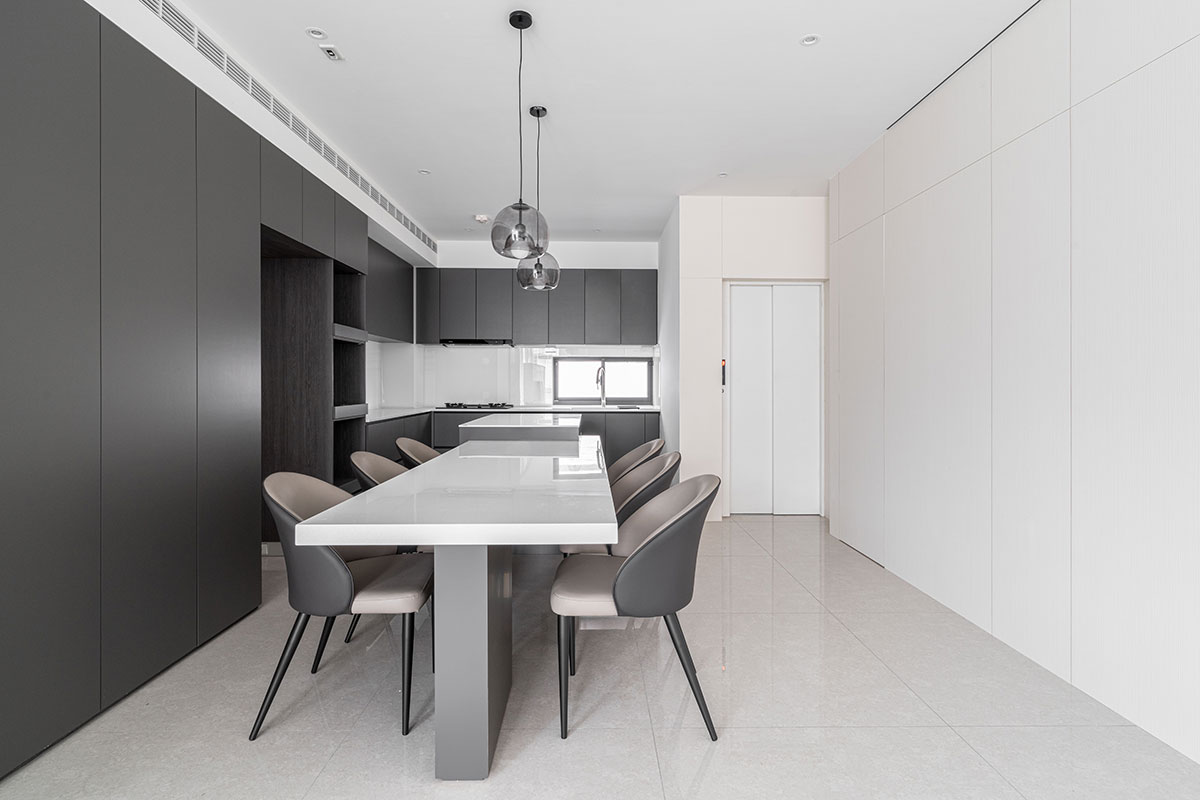 因應業主對家宅乾淨、透亮的期許,本案善用原有格局結合開放式設計,佐以單純的灰白色調與俐落線條,構築素淨簡潔的客、餐廳,二樓以上的私領域則鋪敘大面積木紋,無形劃分區域功能同時,藉溫馨暖意平衡公區的現代簡約,展現不同風貌的互補之美。