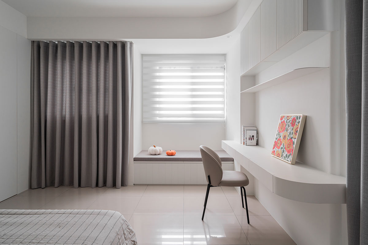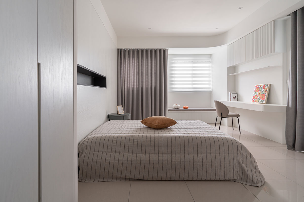推開大門,雙面開窗的格局湧入豐沛日光,令相通的客餐廳更顯寬敞通透,洗鍊的灰白色調構成純粹的公領域,展現家宅的素雅舒適,循序向上探索,柔和木紋包覆私人空間,搭佐天壁的圓弧曲線,醞釀放鬆暖意,守候居者無數安適憩息的日夜,設計師更於每間臥室窗畔設計臥榻,為家人們在公區外創造緊密互動的可能。宅邸本身由明亮、澄淨、開闊三個關鍵詞串成,期許一家三口進駐後,隨時光流轉凝聚更加深厚的情感,創造專屬的天倫日常。