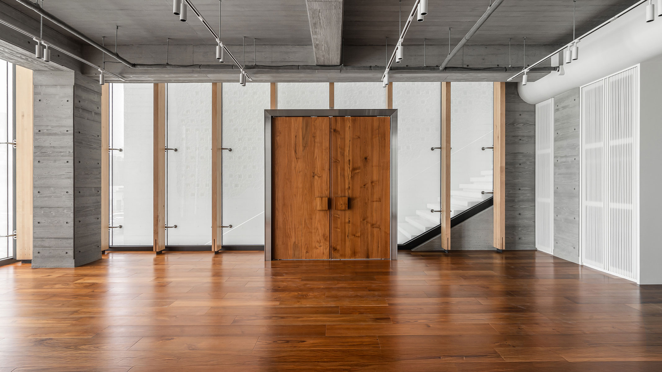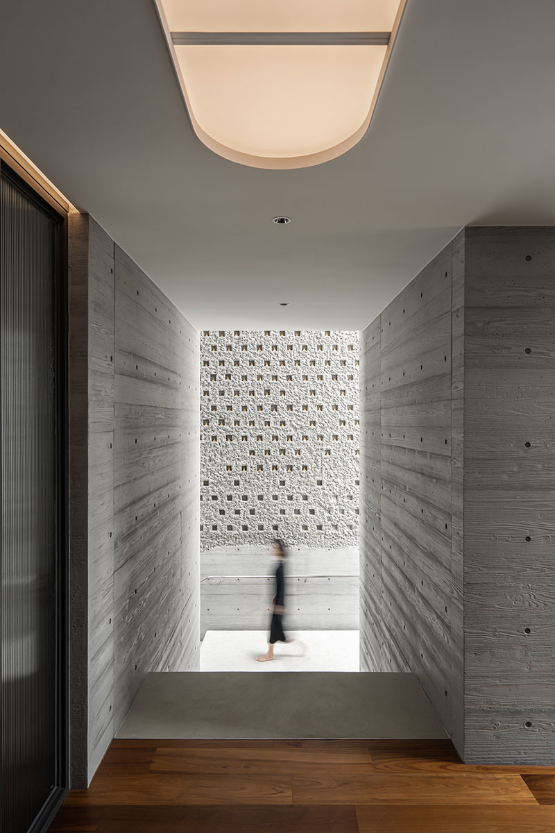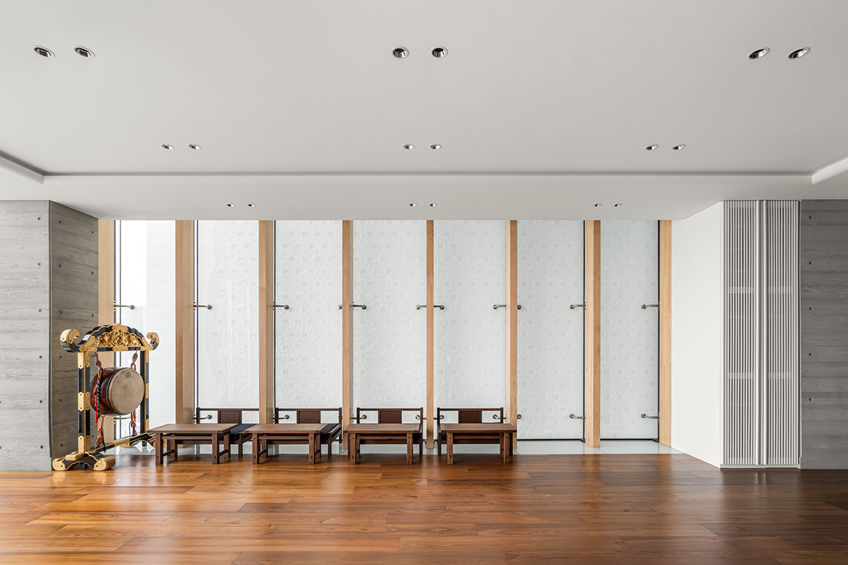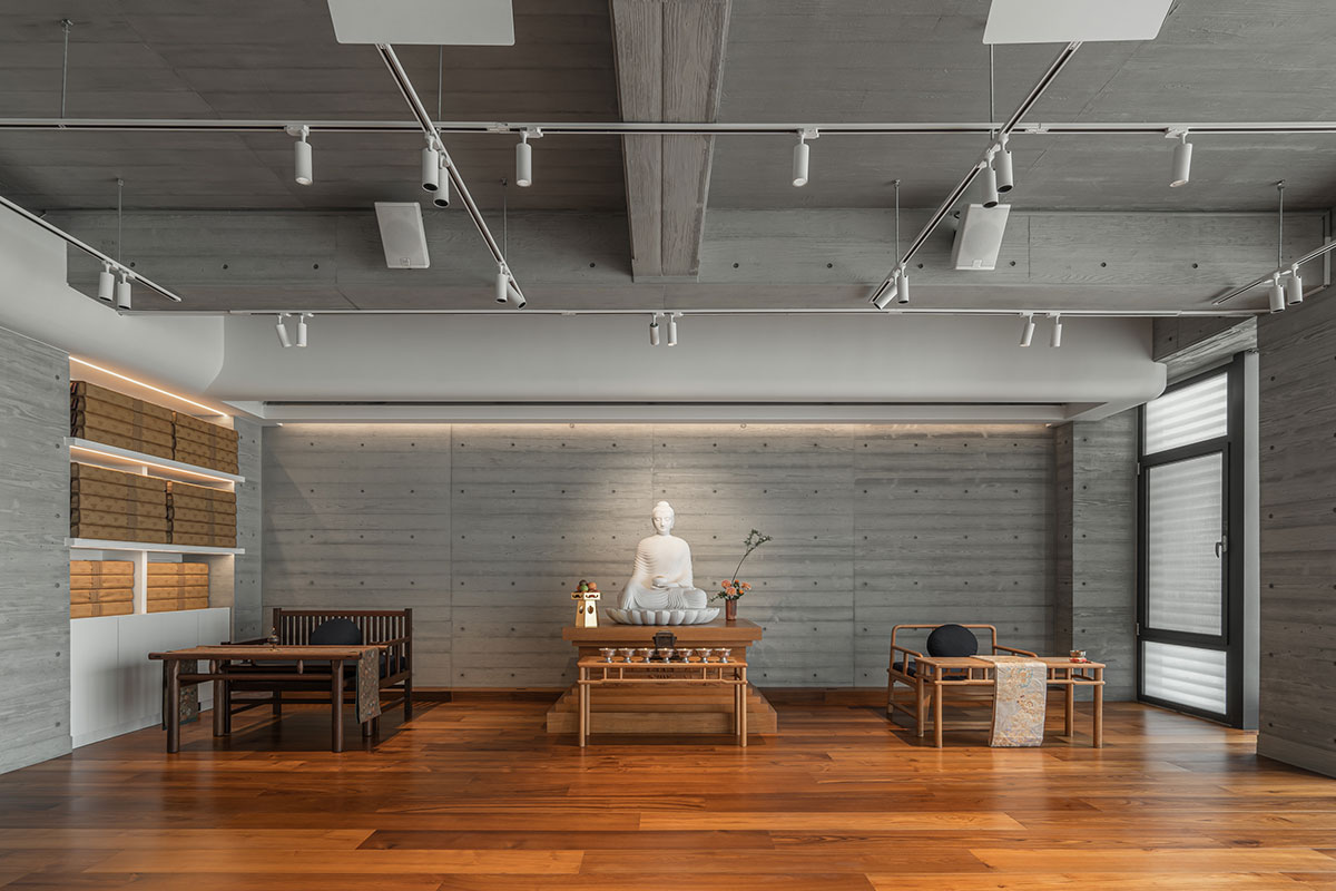 在這座當代宗教建築中,配合建物清水混凝土粗曠的質地,將大量的實木帶入室內之中,為空間注入一縷溫潤與質樸,兩者之間的張力,恰恰對應著藏傳佛教「外在空寂、內在圓滿」的修行境界。