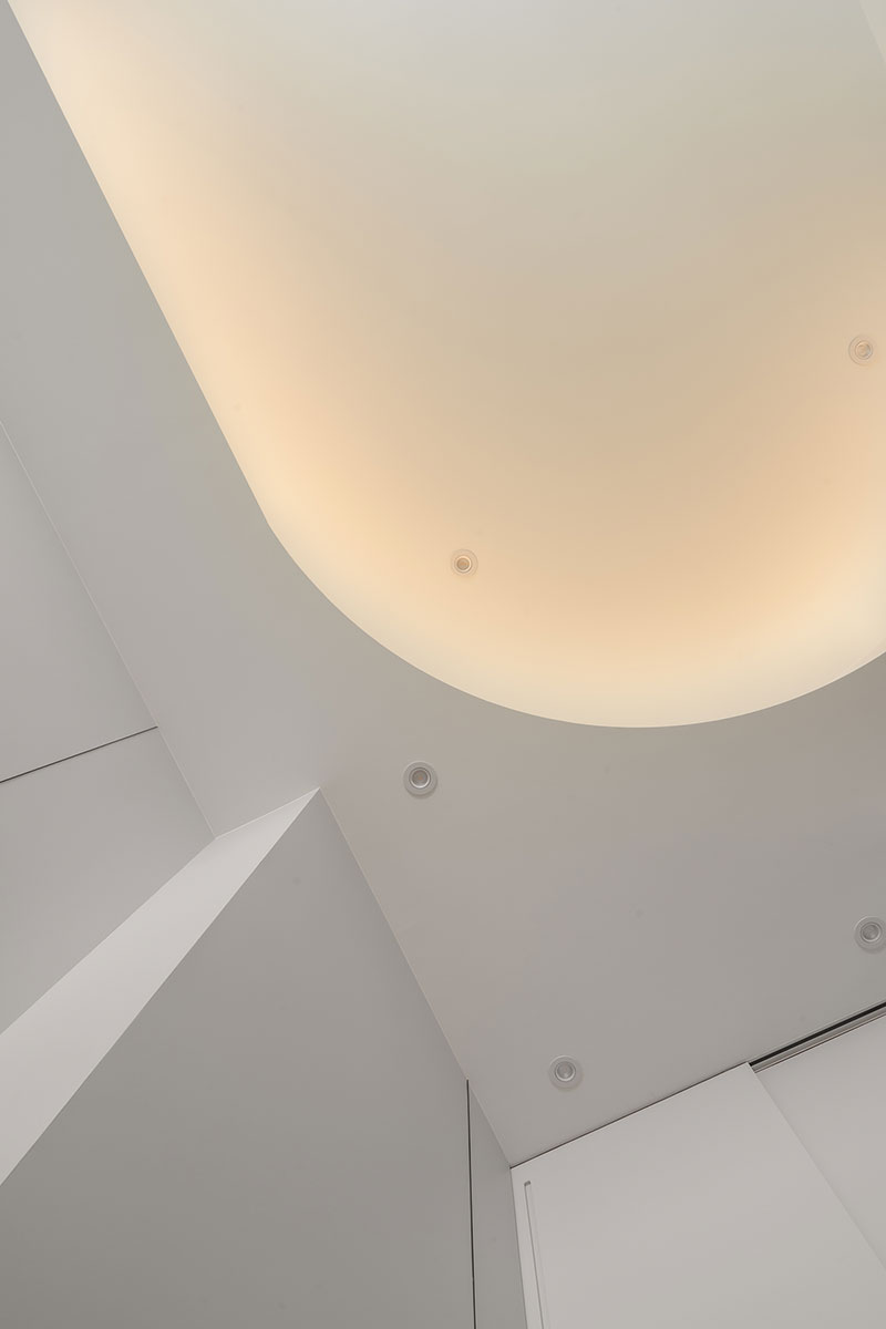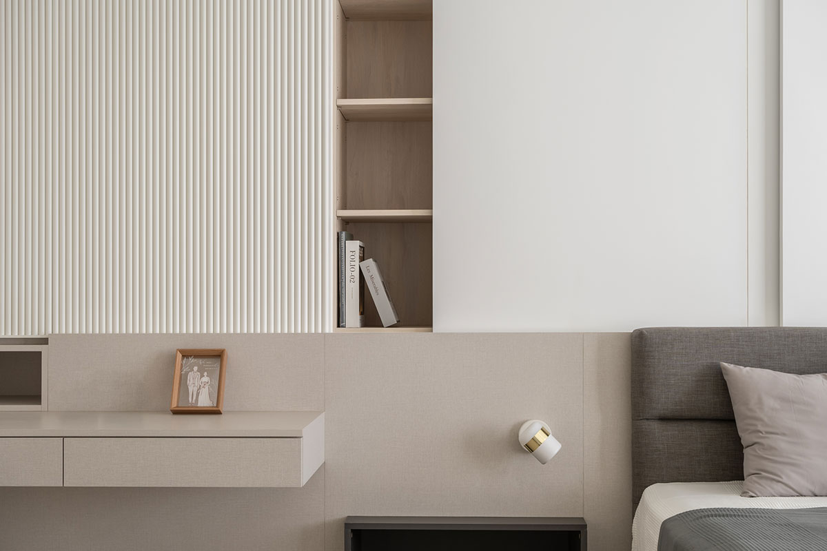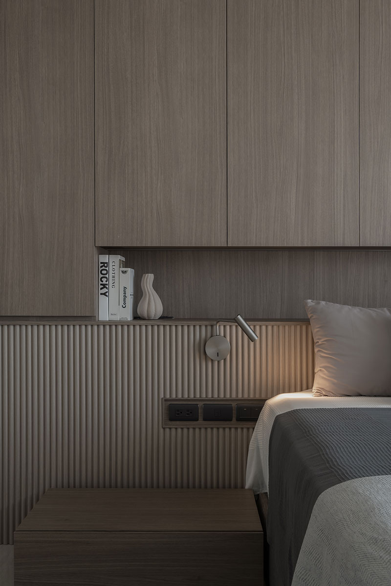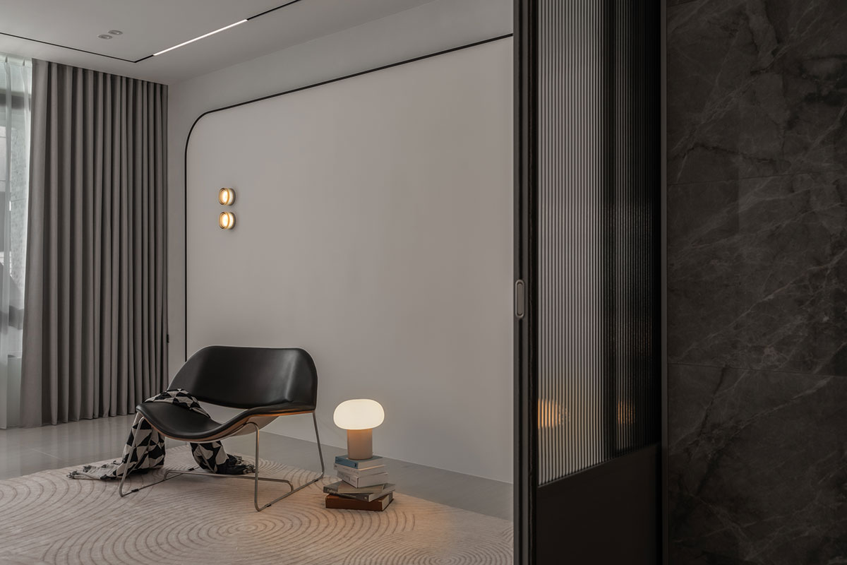 設計以溫潤灰調為基底,曲面天花柔和光暈像自然曙光般溫柔包裹,營造出日夜都宜人的氛圍。牆面細緻的垂直、曲線線條與自然木質搭配,讓視覺充滿節奏感,卻不顯繁複。