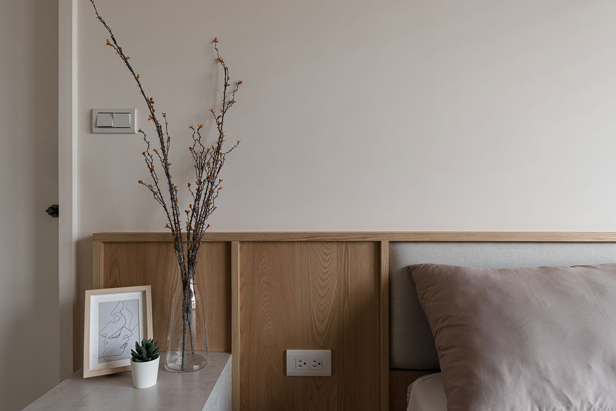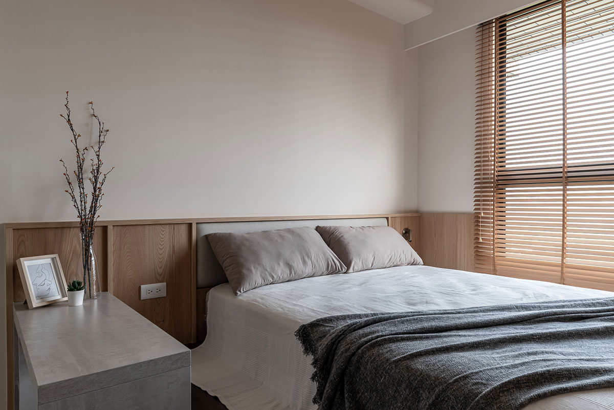 立面設計以垂直木條勾勒秩序感,推開電視牆滑門,隱藏的收納空間,關起來是整齊的立面,打開是實用的生活機能。臥房延續自然語彙,以木皮包覆床頭背牆,搭配溫潤米白、霧灰色調,形塑一處專屬於日常的靜心角落,安靜的剛剛好。