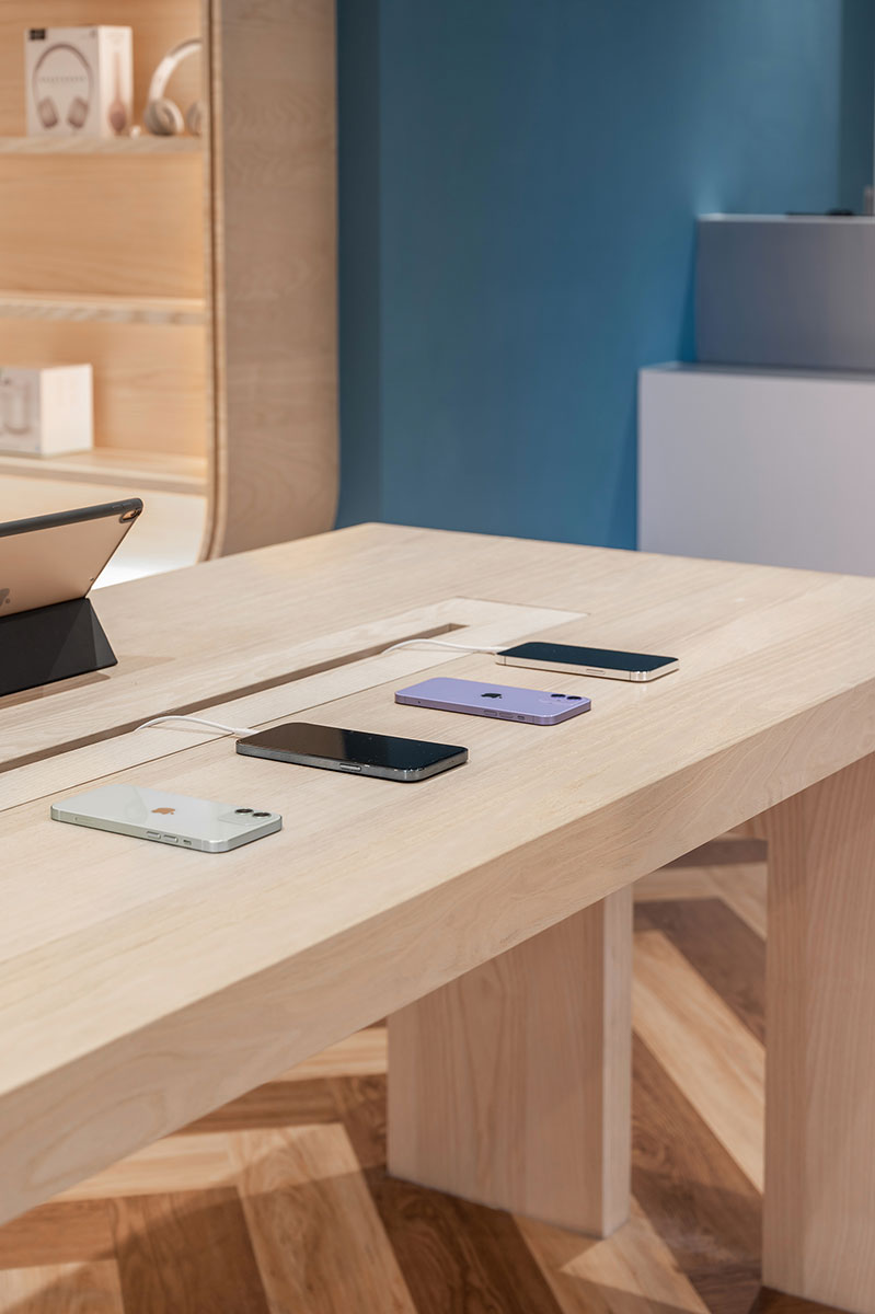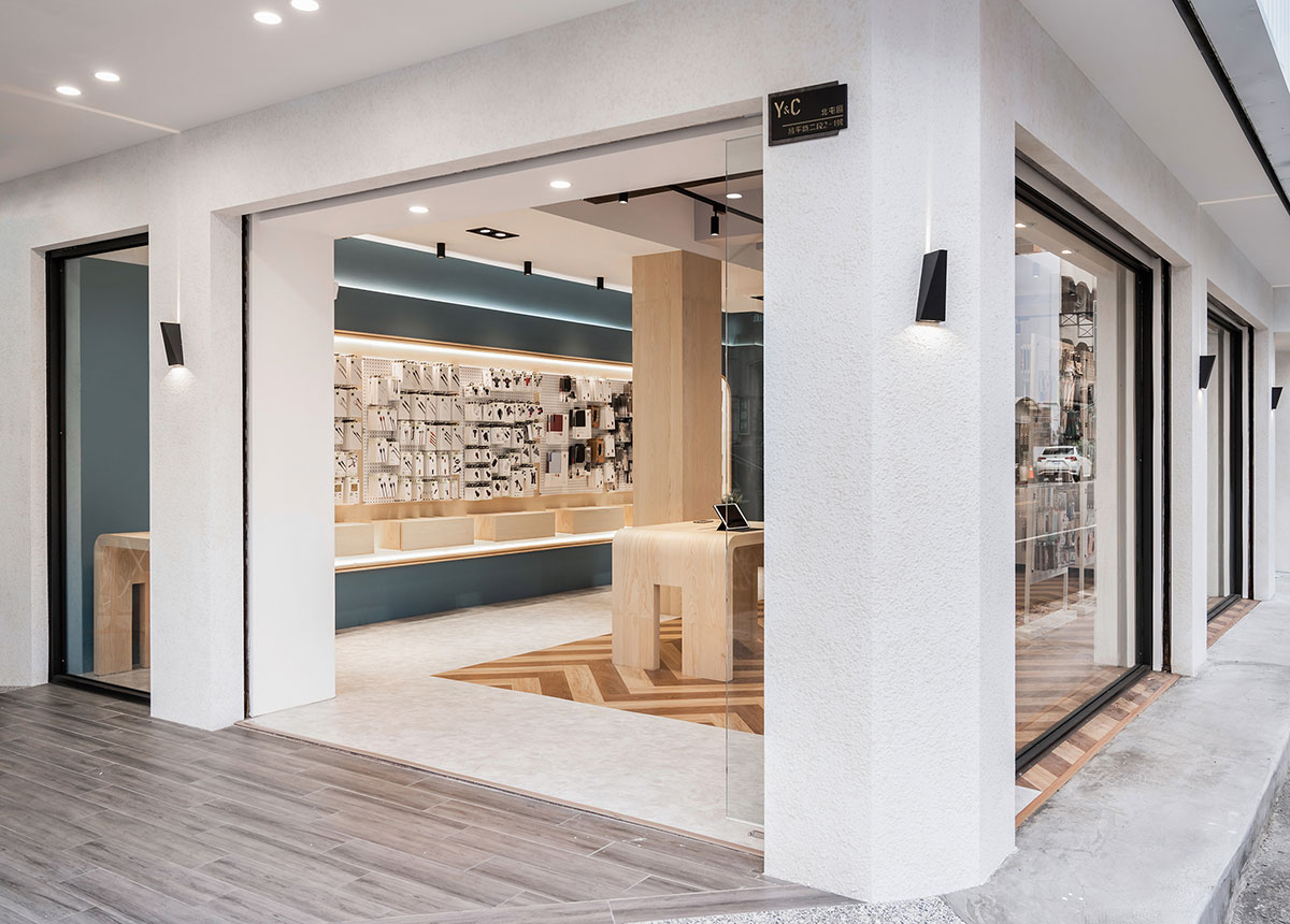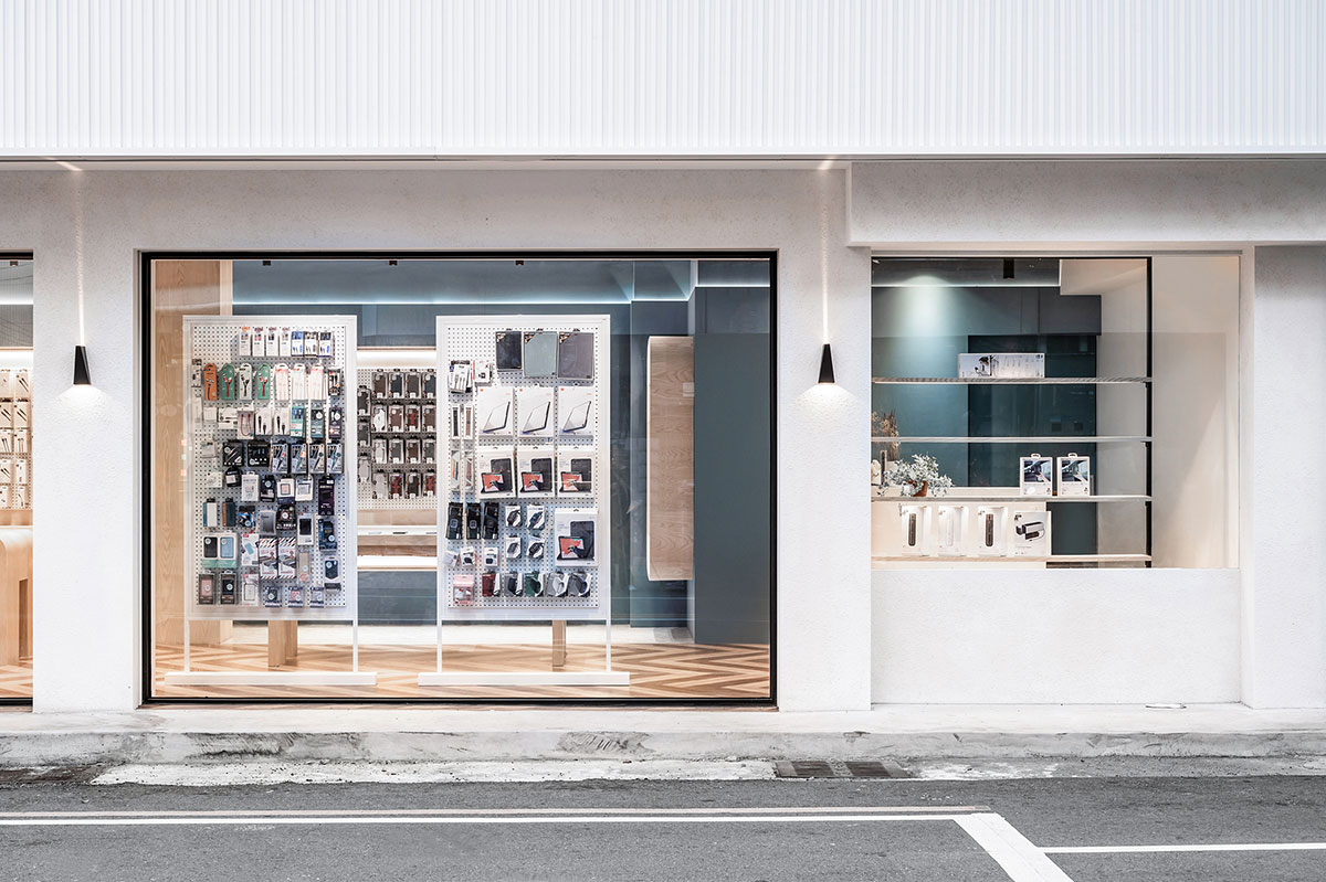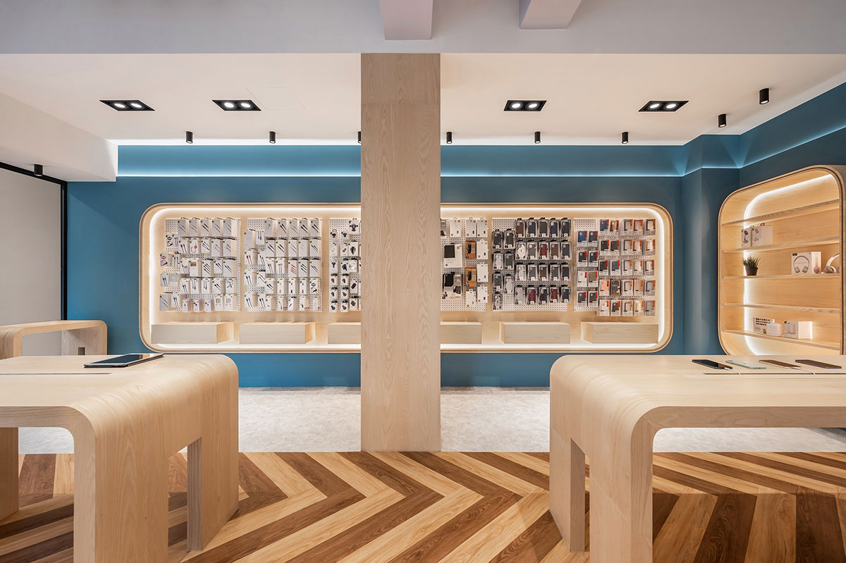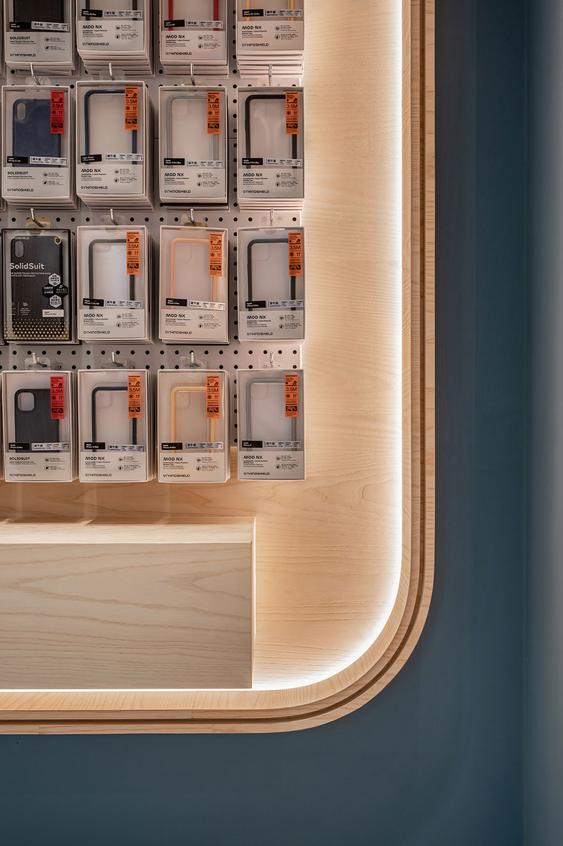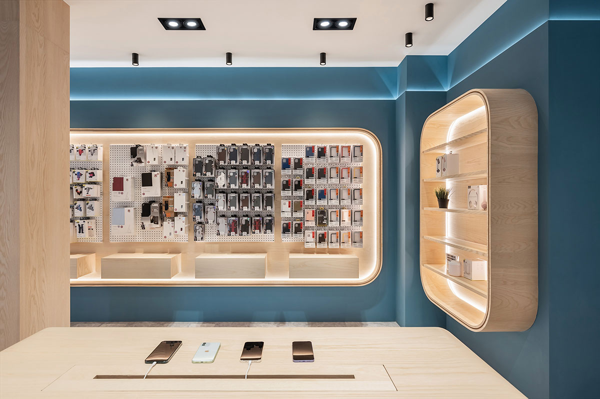 這間全新落成的手機與3C配件專賣店,以木紋質感與藍色牆面為視覺主軸,營造出兼具科技感與溫度的空間氛圍。弧形語彙柔化展示空間的銳利感,提升動線流暢與整體親切度。