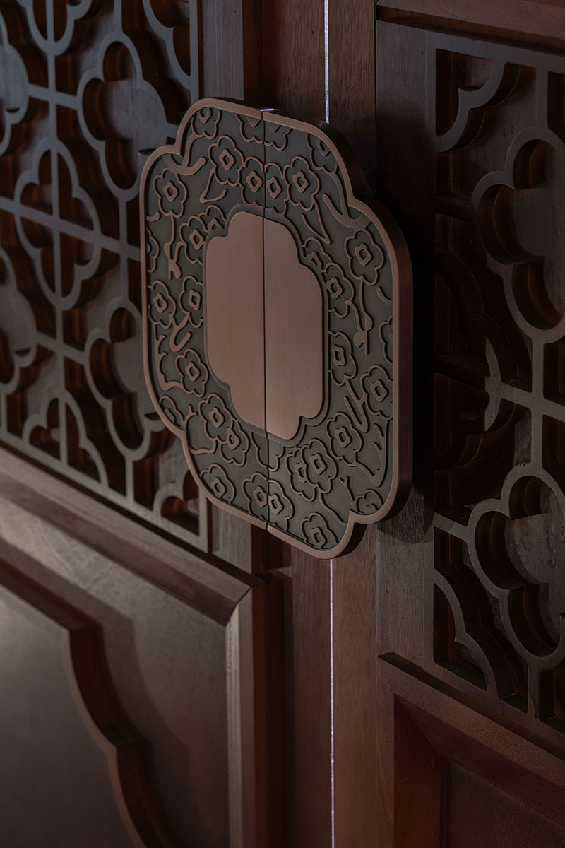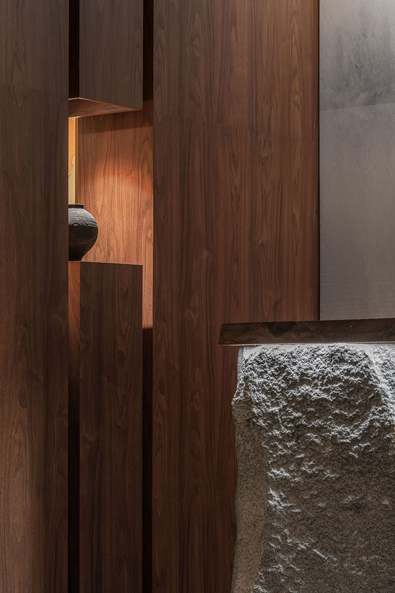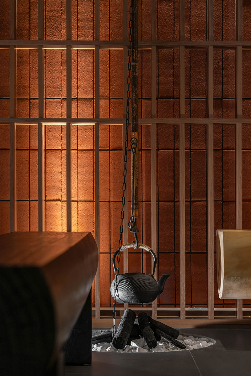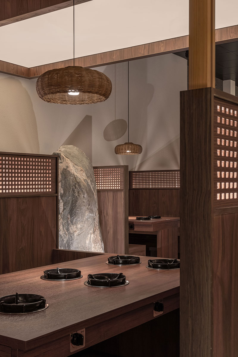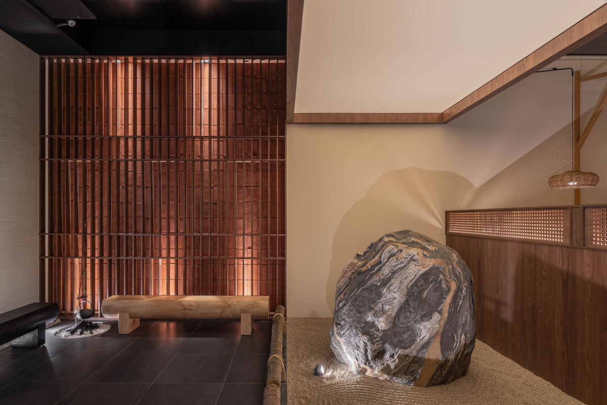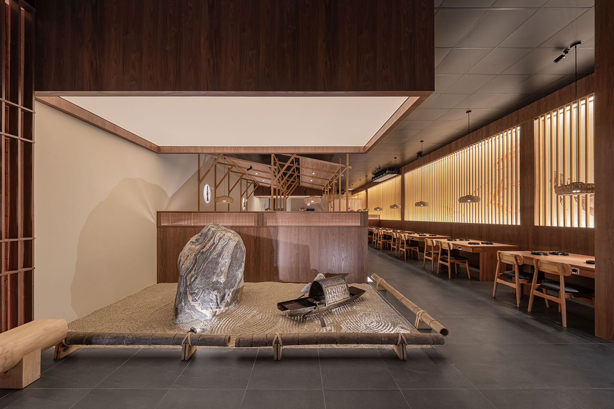 空間主結構採用大量木格柵,延展出清晰的節奏感與水平軸線,搭配手感質材與局部留白,讓每位來客都能沉浸於純粹與放鬆的食事時光。入口處的枯山水裝置由實體大石與仿古小舟組構,傳遞「靜觀自然、品味日常」的價值。