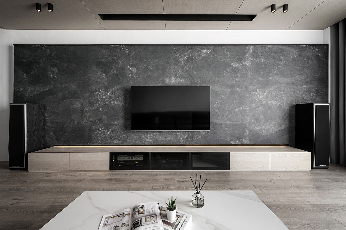 牆面選用深灰石紋作為空間視覺重心,與淺木地坪相互平衡,展現溫潤與理性的平衡。系統櫃體設計融入霧面白、玻璃門片與隱藏式把手,在保持視覺簡潔的同時,也提升了空間的使用機能。
