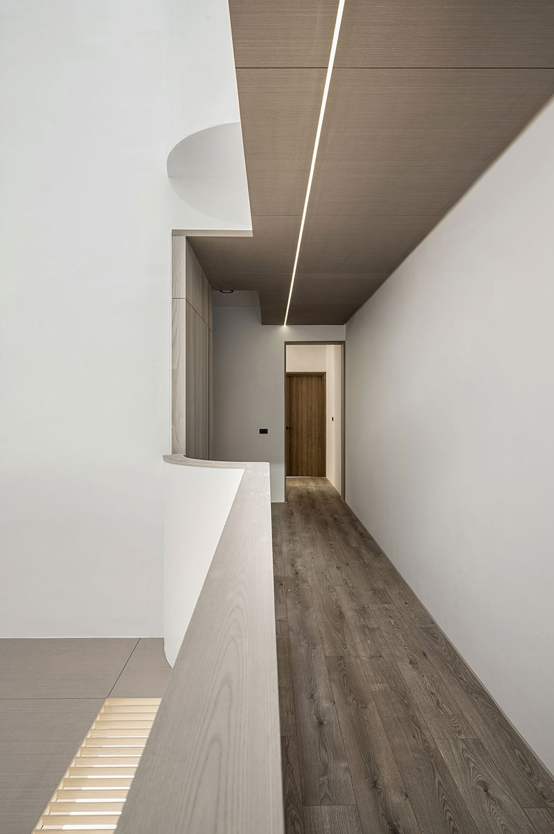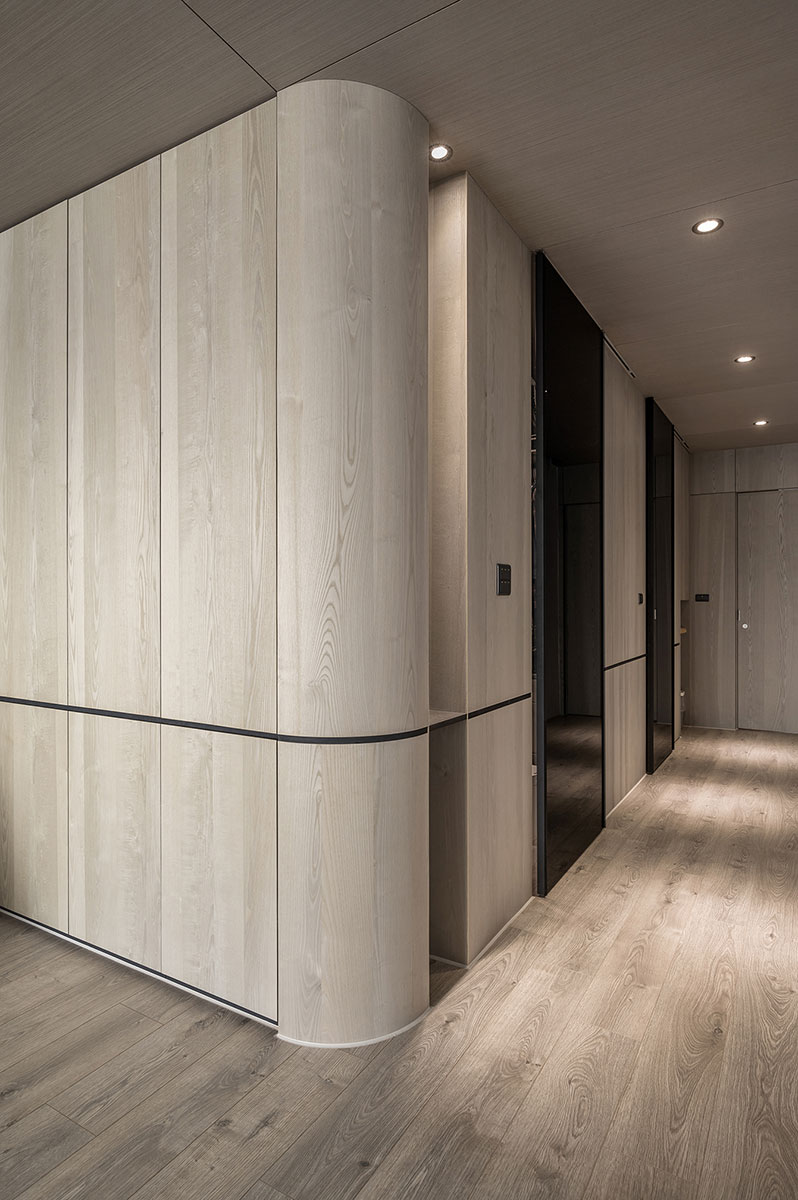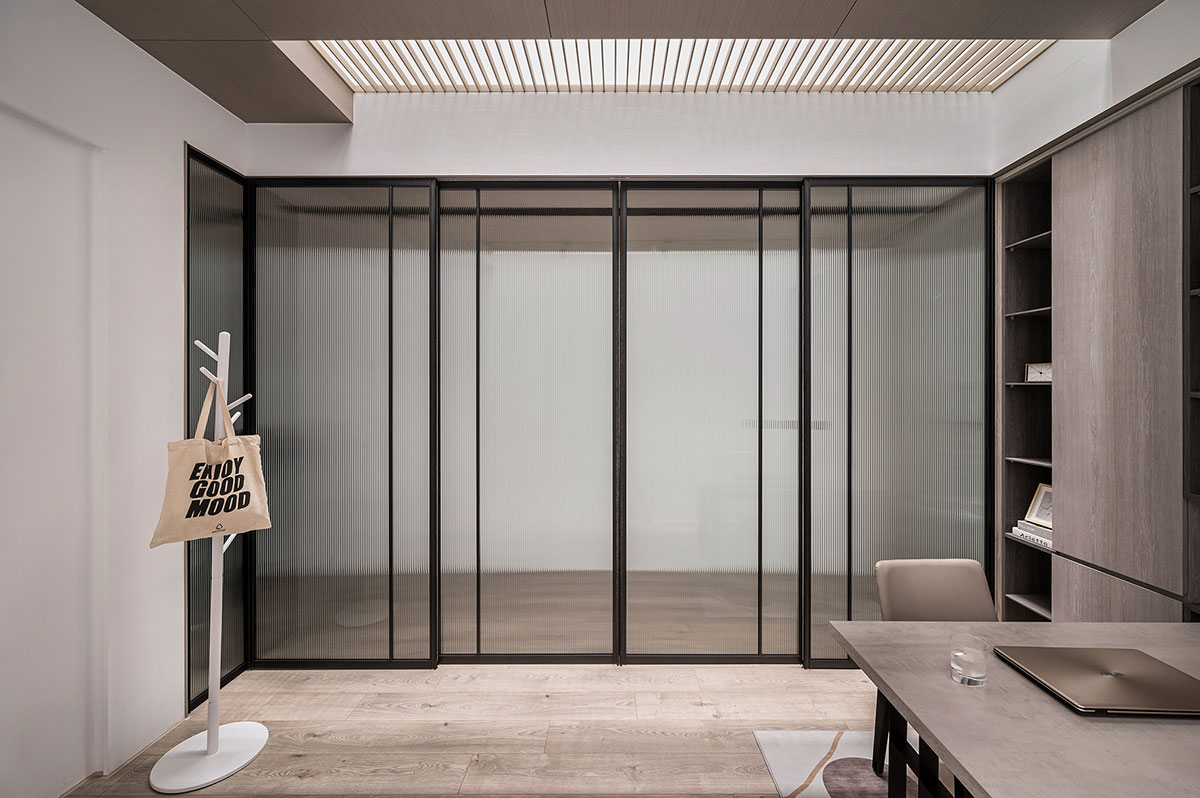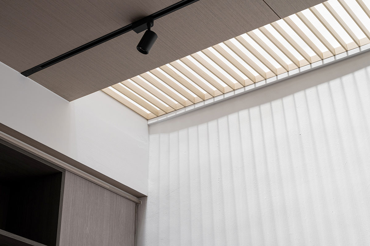 天井以淺木格柵增加空間自然採光的同時,增添一絲沉穩的生活氛圍,加上線性燈光與軌道燈系統的安排,讓光線成為空間的一部分,引導日夜節奏。