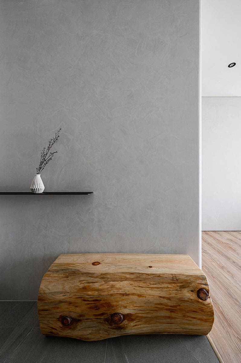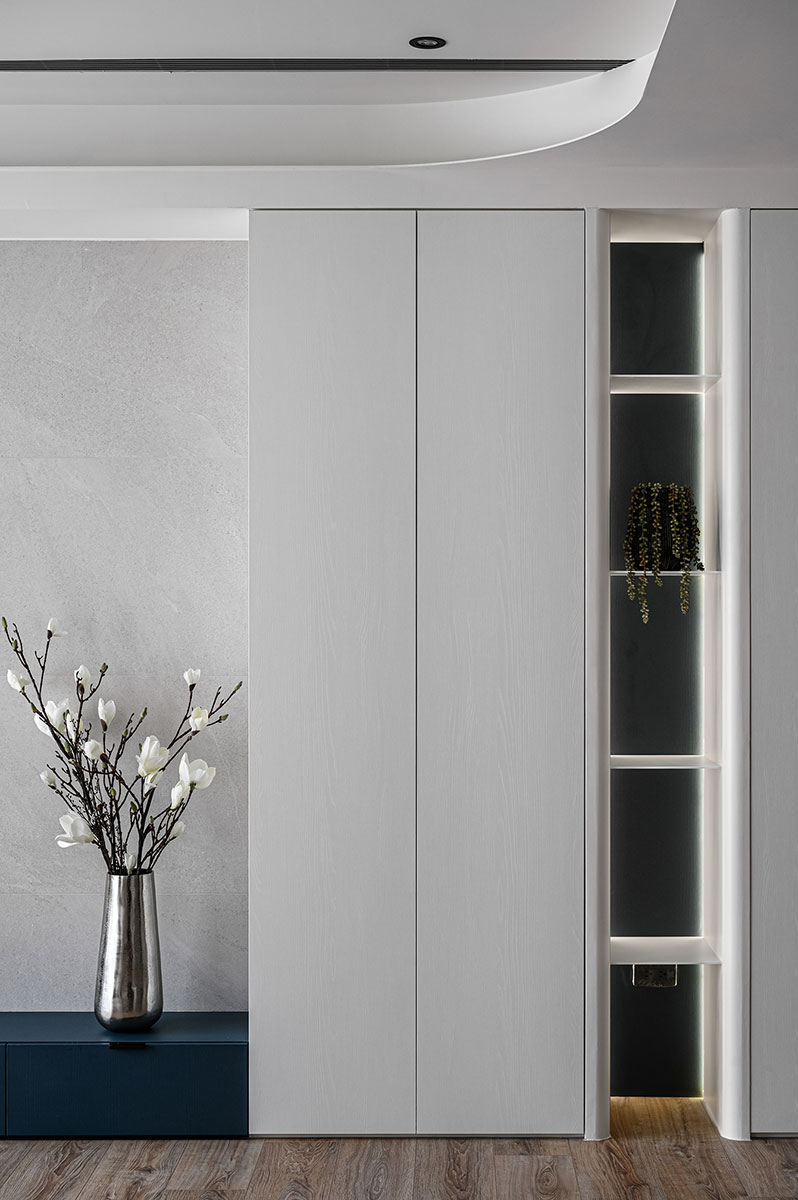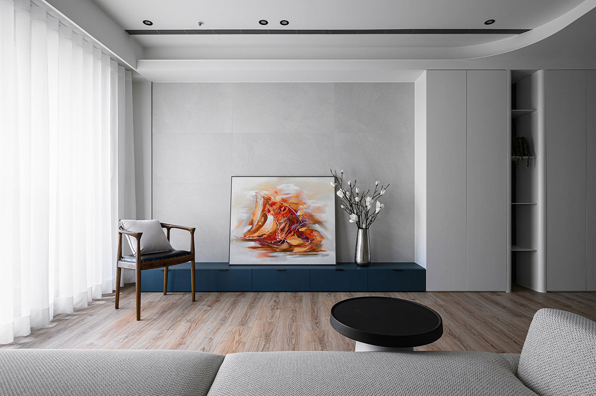 一抹深邃的藍,仿佛將海洋的平靜融入其中。木質地板延展至空間每一處,溫潤的色澤與紋理,讓空間的氛圍既溫暖又有層次。玄關處的原木座椅,靜靜地立於其中,像是海岸邊上的木舟,穩固而沉靜,仿佛走進了一個寧靜的海灣。每一步走過,都能感受到從海洋帶來的悠然與自由。